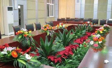 最常见的是非节日的普通布置,这类布置一般多采用鲜花和绿植的合理搭配,一般采用一些高大植物摆在主席台的背后作为为背景,例如棕竹,散尾葵等,然后用些小盆植物或花卉放在主席台的下方作为呼应,常用的植物有一叶兰、一品红、鸭脚木等等植物。另外在会场四周合理的摆放植物也是不错的选择,常用的植物有马拉巴栗、巴西木、绿箩等。另外鲜花的布置也在会场布置里起到画龙点睛的作用。例如在会场入口插一盆较大的迎宾花卉、和在主席桌和宾客的座位上摆放一盆插花,效果不言而语。