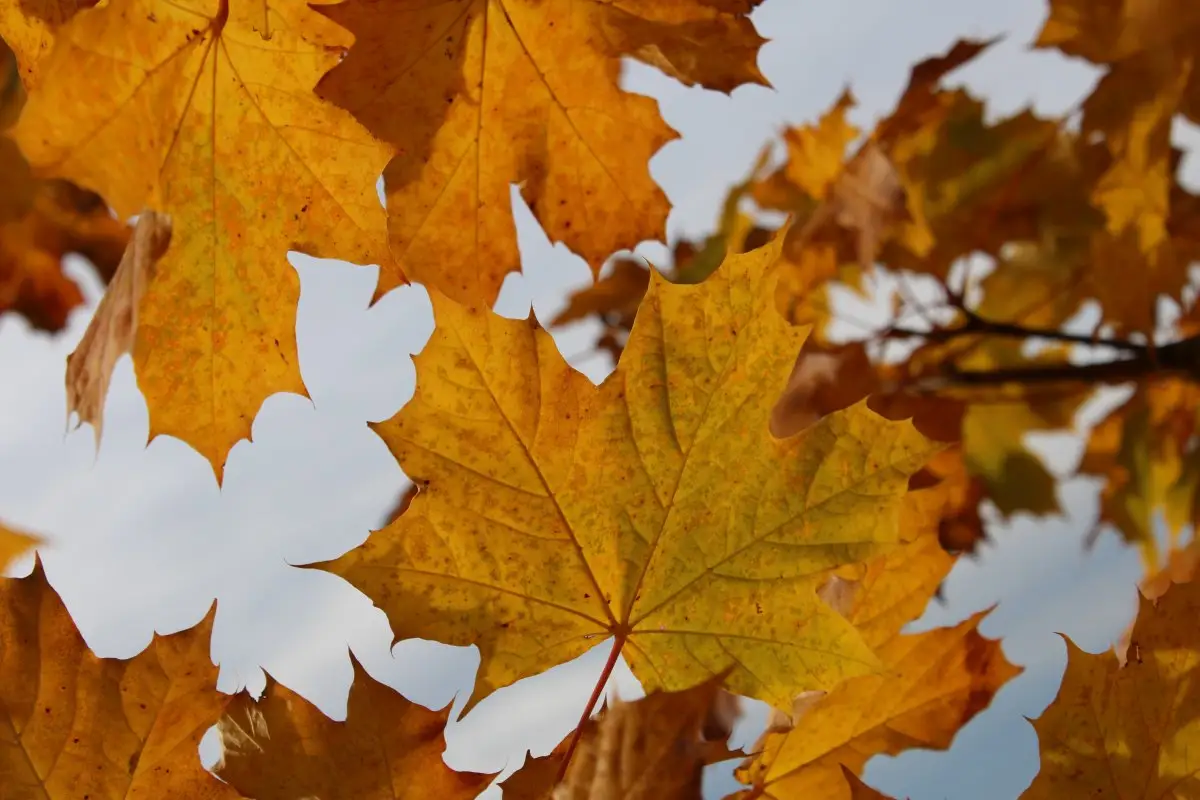 当秋天来临后,白天光照时间变短黑夜延长,树木感受到来自秋天的气候的变化。从而使自身大量的叶红素把绿油油的叶绿素遮盖住,人们自然看到树叶变成红色或黄色的了。一到秋天,落叶树停止生长,只需少量养料就可存活。在落叶前,树干先分解叶绿素,分解产生的物质从叶子输送到树根,作为过冬养料。叶绿素分解后,树叶里就剩下叶红素,所以能看到树叶由绿变黄。