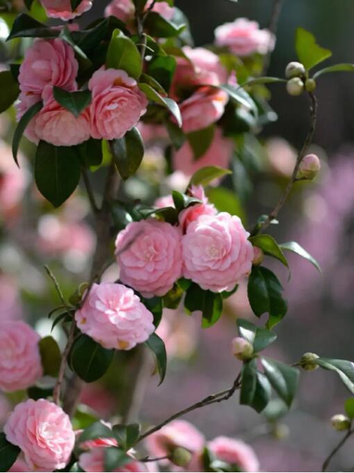 山茶植株形姿优美,叶片浓绿有光泽,花形艳丽缤纷,四季常春,是中国南方重要的植物造景材料之一,亦可用作插花、切花材料,还可大规模种植成专类园,观赏价值极高。山茶开花于冬春之际,曾季狸《句·其七》曾言:“唯有山茶殊耐久,独能深月占春风”,表达了对山茶傲梅风骨的赞美。