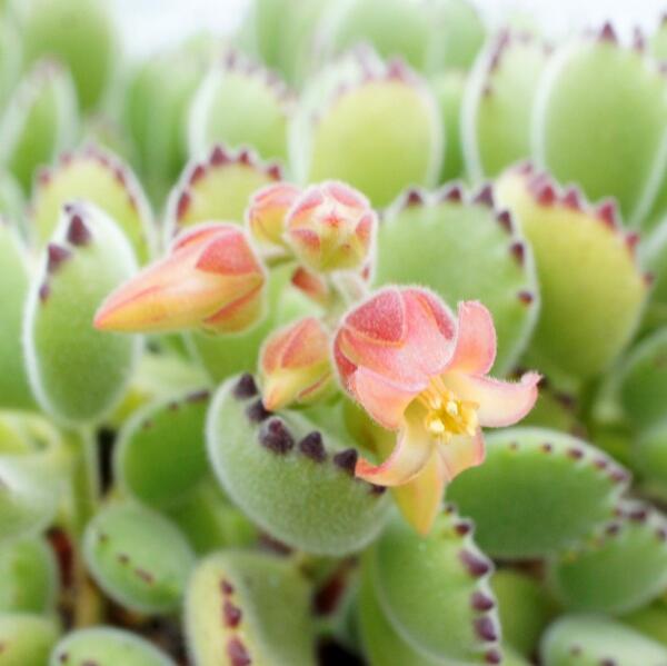 景天科,银波锦属的多年生肉质草本植物,植株多分枝,茎绿色,肉质叶肥厚,交互对生,卵圆形,绿色,密生白色短毛。叶端具红色爪样齿,二歧聚伞花序,小花黄色,花期7-9月。