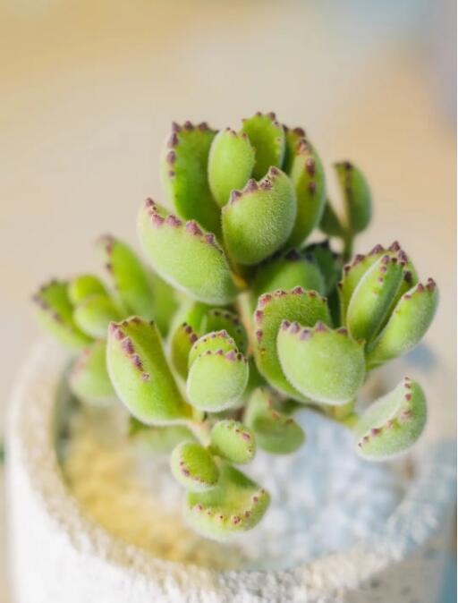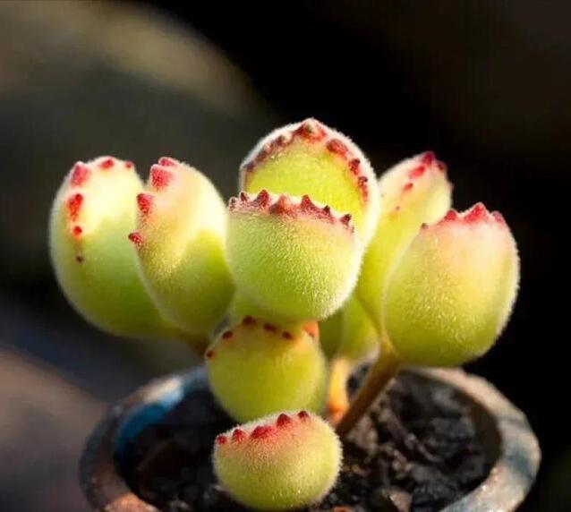 熊童子株形不大,分枝繁多,玲珑秀气,体形文雅,独特漂亮,可作室内小型盆栽。绿色叶片密布白色绒毛,很像熊掌,可用小型工艺盆栽种点缀书桌、窗台等处,也可用为品种收集栽培。