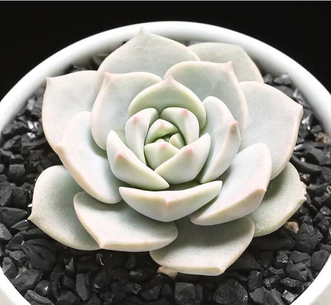 白牡丹平常为白色,日照时间增加后叶尖及叶边会变为粉红色,适合摆放在阳光充足处。其观赏性很强,是市场上常见的观赏植物。