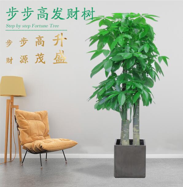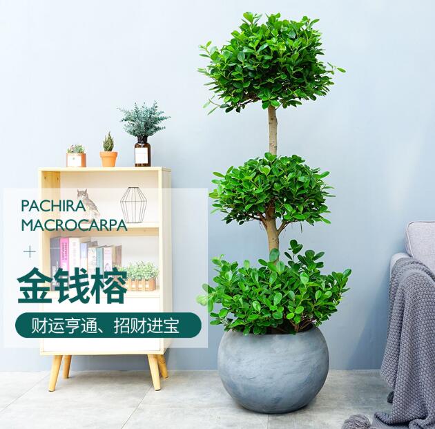 发财树别名瓜栗,从它的名字不难看出寓意财源滚滚。它株形美观,茎干叶片全年青翠,是十分流行的室内观叶植物,幼苗枝条柔软,耐修剪,可加工成各种艺术造型的桩景和盆景。