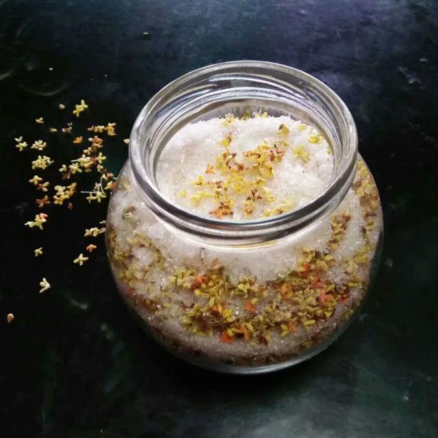 将桂花风干,在容器中倒入麦芽糖或是白糖,然后倒入桂花,上锅蒸10分钟,中途搅拌一下,等到凉了之后倒入干净的容器内密封,放到冰箱内冷藏就可以了。