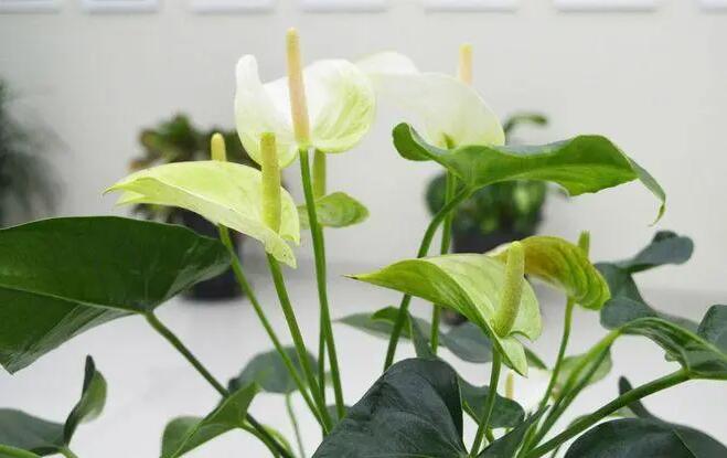 白掌在开花的时候,花色主要是呈为白色,如果施加氮肥过多,导致其它营养元素缺失的话,很容易造成植株营养不良,出现变绿的现象,此时应适当追施一次含磷钾的复合肥,之后施肥少量多次,不可太浓或者过量。