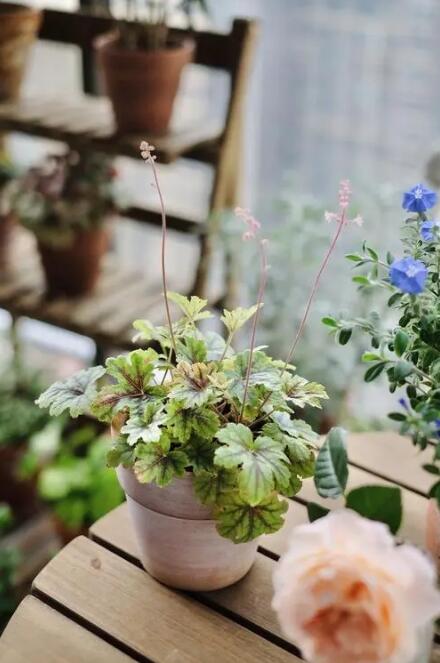 矾根叶片美丽,开花也很有特点,常在春末开,而且一枝花能开好长时间,所以会很耗费养分,一段时间内会让植株消耗太大,从而影响到叶片的生长,所以养花的朋友们大都会剪掉花杆,毕竟矾根在夏天生长还是很怕热的。如果出现上述开花导致植株养分不足了,会不利于度夏,搞不好就会因此而死亡。另一方面,它的花是小小的花箭,观赏价值不如叶子。