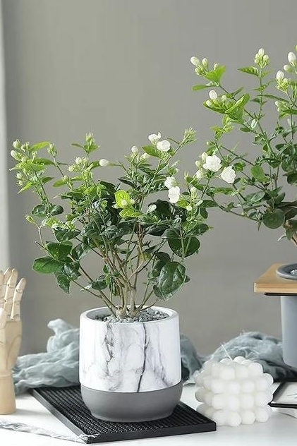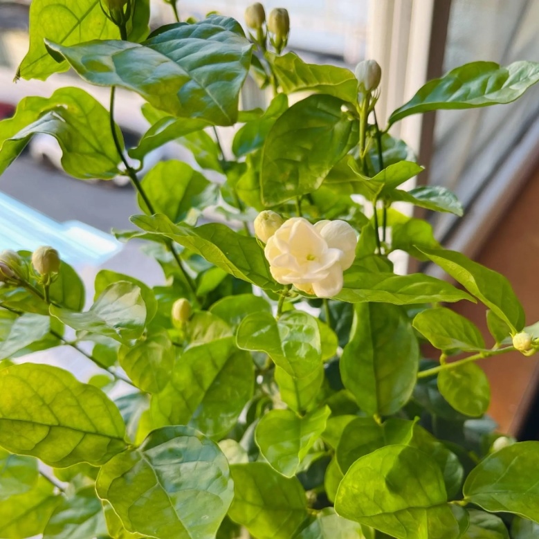茉莉花的花朵洁白无瑕,整体呈现出淡淡的乳白色,加上绿色油亮的枝叶,整体带有清新的气质和典雅的姿态,所以很多花友都喜欢养。再加上花期长,从5月份可以一直反复开到10月份,让家中始终有花可赏。