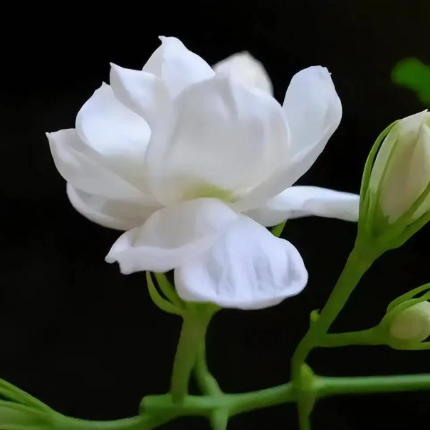 茉莉花,木樨科素馨属直立或攀援灌木植物。茎秆较高,呈圆柱形,中空;叶相对而生为纸质,呈圆形,叶柄较长;花为伞状,花苞较小,呈锥形,花冠白色,呈长圆形;果实球形,黑褐色。茉莉花花期5~8月,果期7~9月。茉莉花是福州市花。茉莉花在菲律宾语中被称为三巴吉塔,据说一个小伙,接受了姑娘的求爱,将茉莉花送给她,并告诉她三巴吉塔意为“我答应你”。
