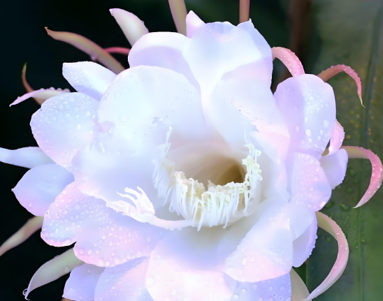 昙花,俗称“月下美人”或“琼花”,属于仙人掌科昙花属。其最大的特点是在夏秋季节,特别是在夜深人静的时候开放。昙花的花朵巨大、色泽纯白,散发出淡淡的香气,但仅在夜间开放几小时后便迅速凋谢,因此得名“昙花一现”。这种独特的生物现象常吸引花卉爱好者和摄影师的极大兴趣,使其成为园艺中的珍品。