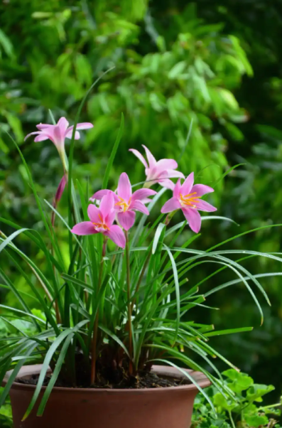 风雨兰喜阳(全日照),产于美洲热带,韭兰株高约15~30厘米,成株丛生状。叶片线形,极似韭菜。花茎自叶丛中抽出,花瓣6枚。韭兰花形较大,呈粉红色或浓桃红色,花瓣略弯垂,成株每个鳞茎都能开花,丛生的花团,在艳阳下大放异彩,千娇百媚,人见人爱。韭兰花期4~9月;适合庭园花坛缘栽或盆栽。