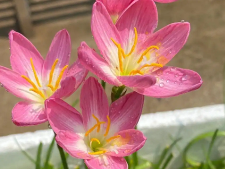 风雨兰是对石蒜科多种长相相似的球根植物的统称,因为它常常在春夏之际大雨过后突然的盛开,花型像百合,所以又称雨百合,常见的种有韭莲、葱莲等。花色多样,有粉红色、浓桃红色、黄色及白色等。