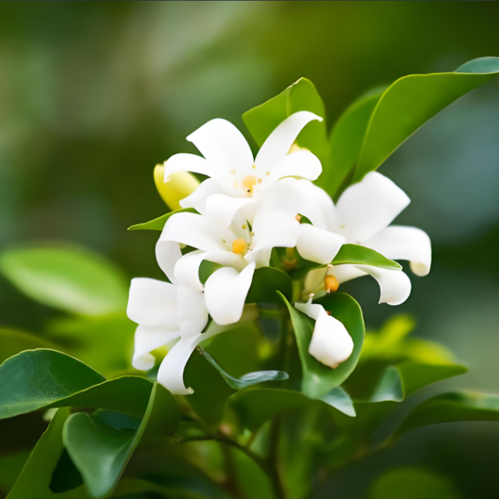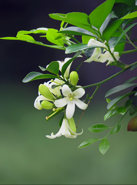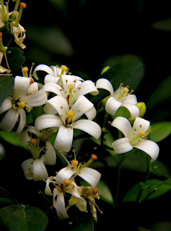 花序为伞房状或圆锥状聚伞花序,顶生,或兼有腋生;花白色,芳香;萼片卵形,长约1.5毫米;花瓣有5片,长椭圆形,长1-1.5厘米,盛花时反折;雄蕊10,较花瓣稍短,花丝白色,花药背部有细油点2颗;花柱及子房均淡绿色,柱头黄色、粗大。