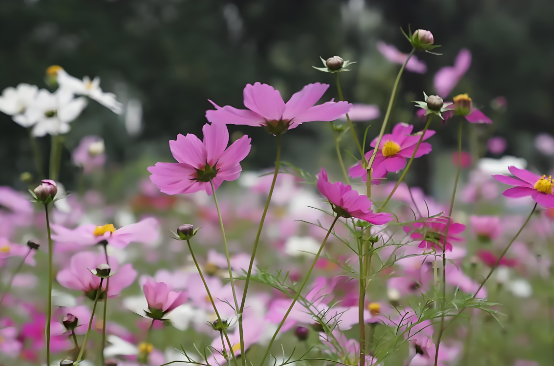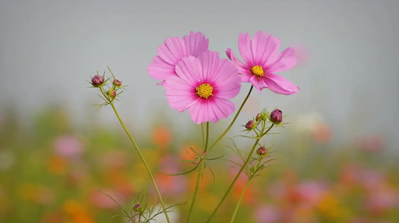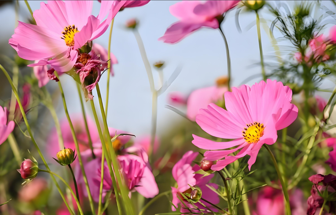 波斯菊的花朵具有多种颜色,如粉红色、白色、红色和紫色等,且花形大而美丽,非常适合花坛和花境的点缀。从晚春持续开花至秋末,花期长达数月,为园林提供持续的色彩和活力。