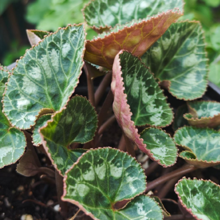 仙客来是多年生草本植物。块茎扁球形,直径通常4-5厘米,具木栓质的表皮,棕褐色,顶部稍扁平。叶和花葶同时自块茎顶部抽出;叶柄长5-18厘米;叶片心状卵圆形,直径3-14厘米,先端稍锐尖,边缘有细圆齿,质地稍厚,上面深绿色,常有浅色的斑纹。一些植物学家认为叶片上的杂色是一种天然的破坏性伪装,以免受动物损害。